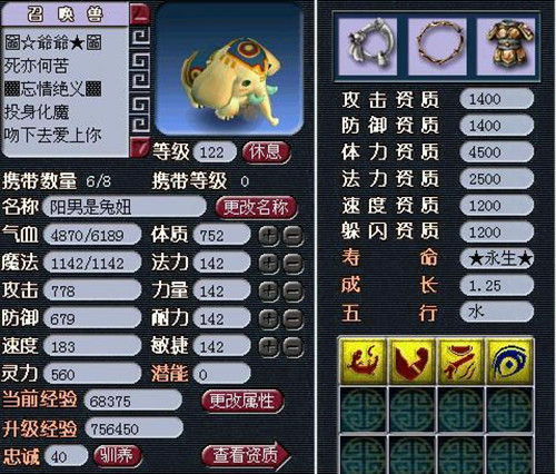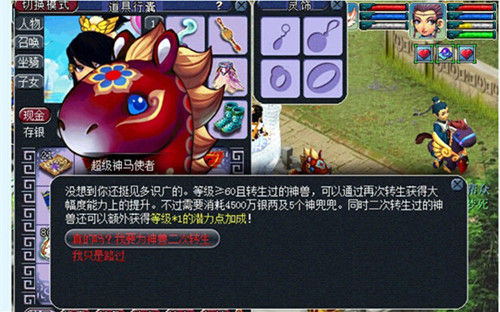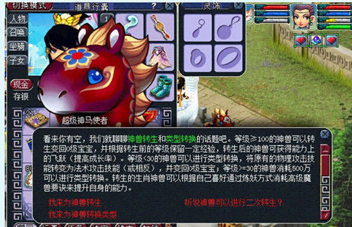 作为一只神兽,仅仅是卖萌和永生,显然不能够满足神兽们骄傲的身份。于是《梦幻西游2》推出了“神兽转生”功能,前提条件是等级到达100级,然后可前往长安天台相对应的神兽使者进行交谈后转生。
