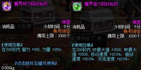 每日礼盒中开出的消耗品用处同样很大,可以在5种指定的消耗品中随机开到一种阿拉德丽人礼盒,分别是雷米的祝福(5个)、魔界战力释放秘药(10个)、魔界潜力释放秘药(10个)、闪亮的雷米援助(10个)和闪亮的世界仪(10个)。其中雷米的祝福和两种魔界秘药都是新版药剂,在团本中可以发挥极大的作用。