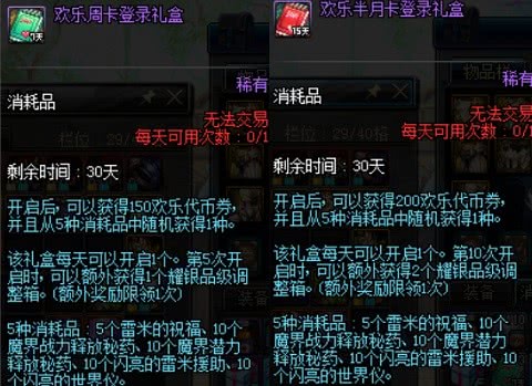 当购买了两个礼包并使用后,勇士们可以获得7个周卡每日登陆礼盒和15个半月卡每日登陆礼盒,并且购买消耗的点券也会通过礼盒的方式全额返还为欢乐代币券,这样看来每日登陆礼盒的奖励就等同于白送的了。
