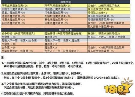 献祭书有20个槽,可以存在20个能力,每达到一定经验后开启下一个能力。能力永久保存。能力有金,银,铜之分。相同金色品质能力最多存在一个,银色三个,铜色五个。能力上是金色更好一些。每个能力都对应一个棋子,献祭普通棋子一次加50经验,琥珀棋子一个300经验,献祭对应棋子翻倍。具体能力如下图(抱的贴吧老哥@caya 的)