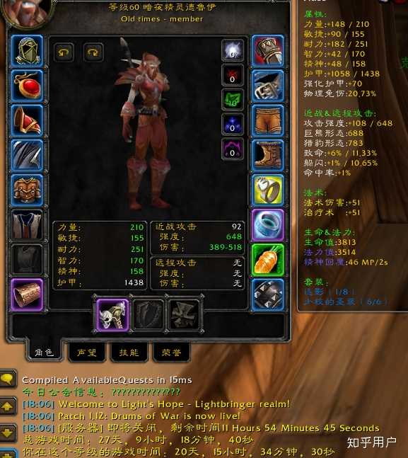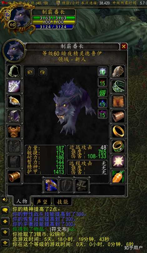 上图是我N服第一个号,是我正经第一个德鲁伊号,用时6天18小时,练到60的时候部族制皮剥皮急救烹饪全300,大概是16年左右刚开1.4版本甚至灼热都没任务的时候练的,以现在的角度来看练的非常慢,但对于大众应该算是中等水平了。