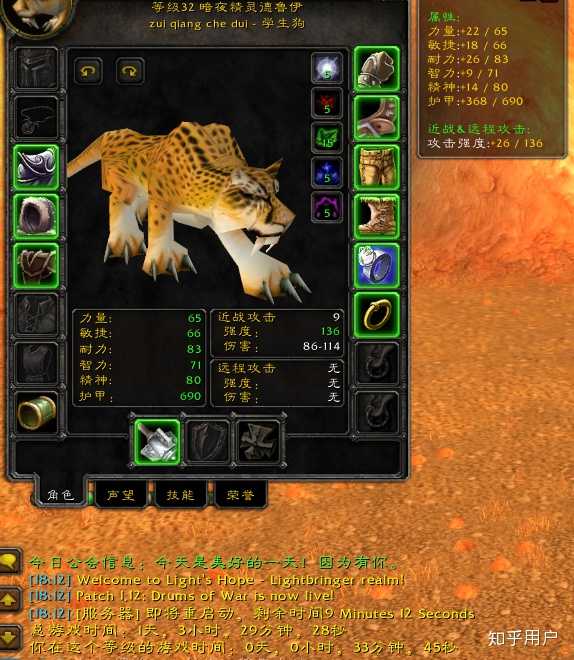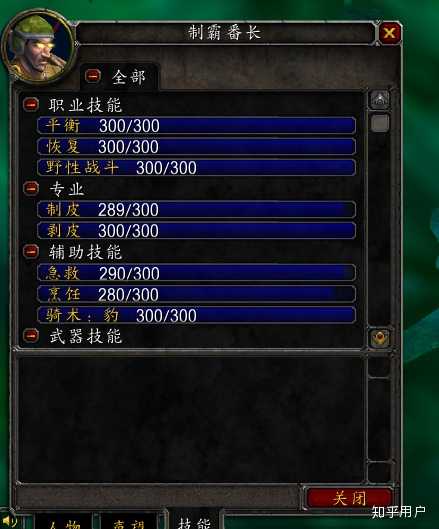 而这个图就是最近练的,27小时32级半,全程虎牙直播,还包括制皮150,急救200,烹饪180,剥皮225。具体练级速度你们自己细算吧。