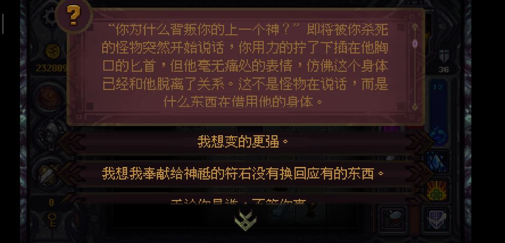 当你背叛神后面选择契约之神时有概率发生(是直接背叛不是灰精灵去掉),选择第一项会给你一个契约之神的纹身符文守护者,但因为我提前把契约之神纹身纹满了所以并没有叠加给我一个 选择第二个是随机失去两个符石增加10点生命上限 ——————————(分割线)—————————————————— 说一下关于巫妖,如果你在碰见巫妖之前就捡到了他的匣子,后续碰见巫妖选择给他你不会受到伤害灵魂会回满,如果没捡到匣子就碰到了巫