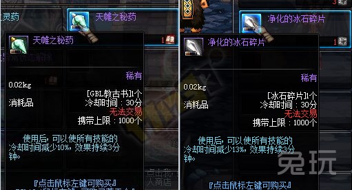 2种药水分别在天威巨兽的伊莎杜拉和北方避难所的敏泰兑换,兑换材料十分便宜,完全是白菜价。可以全程全PL全副本的使用。相当多了一个减CD的装备!