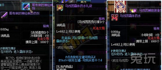 第一种可以在暗黑城夏洛克那兑换,兑换材料也比较便宜可以多备点。马戏团霸体药也十分容易获得dnf药剂大全,3次马戏团能换的霸体药都能超过30个。