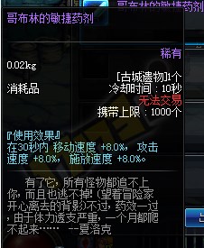 哥布林敏捷药剂可以在暗黑城的夏洛克兑换,兑换材料也比较便宜可以全程使用,超速胶囊非常规药剂可以竞速同。