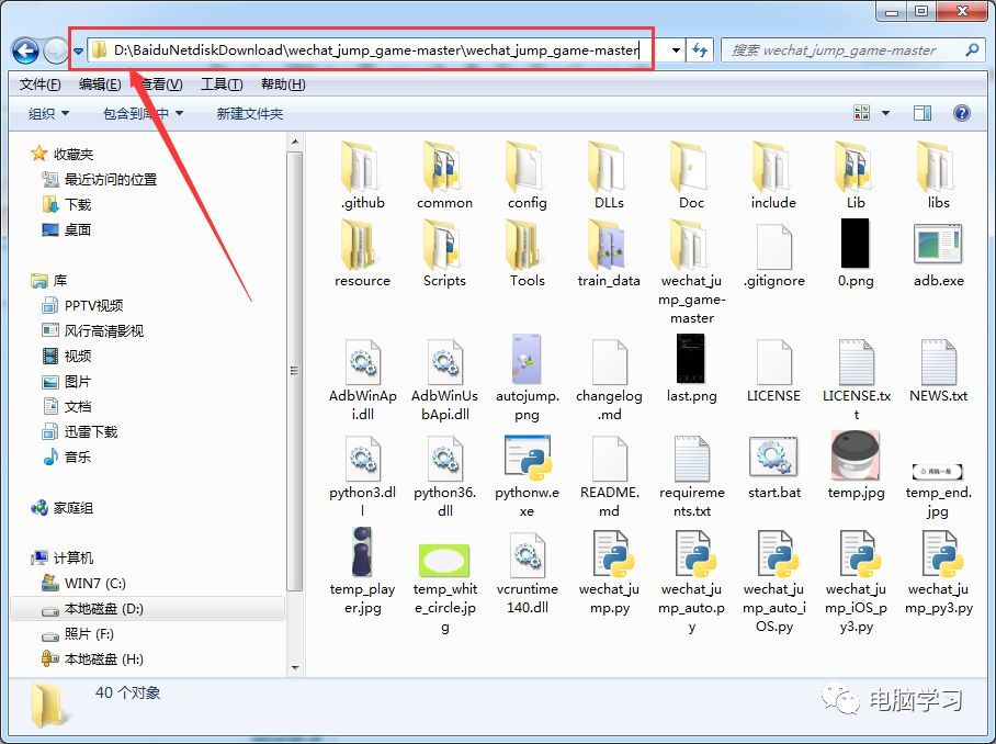 第六步:解压弘这羹夹下,然骸这羹夹的路径,一会要用。(我的是 D:BaiduNetdiskDownloadwechat_jump_game-masterwechat_jump_game-master),如下图:
