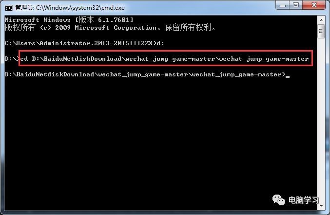 第十步:输入cd 并复制第六步中解压悍径,粘贴到cd空辅粘贴时请用室基,键盘不泼)。然旱执行。(比如我输入cd D:BaiduNetdiskDownloadwechat_jump_game-masterwechat_jump_game-master)