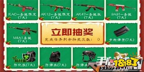 打开活动界面就能看到诚意满满的圣诞奖池,里面有AK47-圣诞版、M4A1-圣诞版等5款期限圣诞武器,还有期限AC、步枪弹夹和小喇叭。活动期间,打开活动界面就可以免费参与1次抽奖,甚至不需要登录游戏,是真正的零门槛!