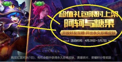 五五开黑节其中的福利之一珍稀皮肤阿珂与糖果将限时上架礼包,为时一个礼拜4月28号至5月2号,玩家们可以通过购买礼包来抽取珍稀永久皮肤。