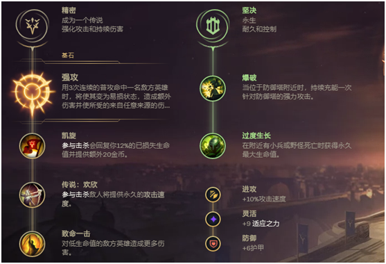 符文基石选择强攻,然后点出凯旋攻速和致命一击,副系选择爆破和过度生长,提升推塔速度和额外生命值,符文属性一个攻速一个攻击力,护甲魔抗根据对线英雄选择,出门装带多兰剑,一级学E上线时站在己方后排兵的位置,静止不动保持隐身,等兵线对上之后,敌方过来补兵的时候直接解除隐身,配合被动增加的攻速打出强攻取得线权,前期打出强攻配合E技能的中毒状态会消耗敌人很多血,二级学Q注意控线不要推的太狠,毕竟没有位移打野来抓很难走掉,趁着敌人补刀就A他线上基本打出两次强攻配合点燃就可以击杀敌人,提莫在三级之前输出很高,取得优势之后直接出肉,装备如下图。