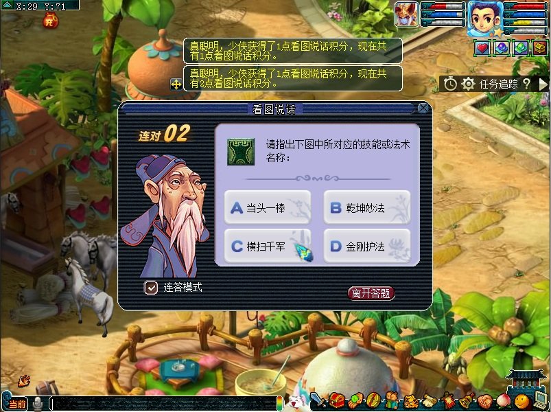 知识老人每次停留10分钟,回答出他的问题将获得看图说话积分。答题时,玩家可通过勾选答题界面上的“连答模式”选项选择答题模式:若勾选则为连续答题模式,每答完一题后会自动出下一题并扣除20体力,直至知识老人离开或角色体力不足;若不勾选则为单次答题模式,每答完一题后答题界面将会消失,出题时扣除20体力。