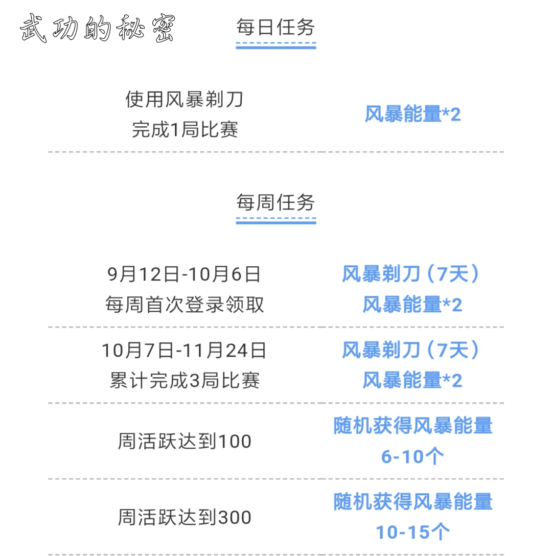 根据官方公布的任务表来看,风暴剃刀整体的活动难度并不大,每周的活跃要求仅仅达到了300(一天一百五活跃,只需要两天就可以了呢),但是还要注意,我们还需要每天去用风暴剃刀完成一局游戏。
