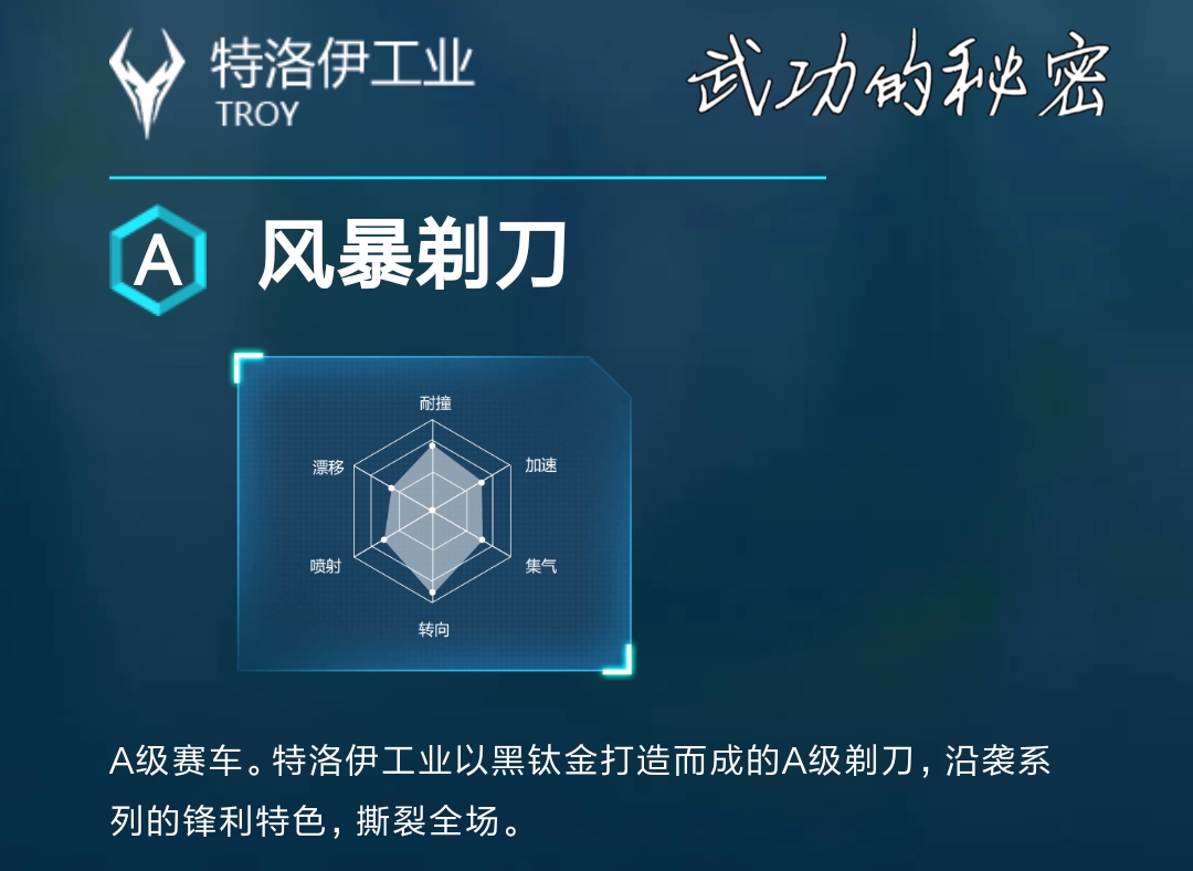 风暴剃刀的整体外形也是非常酷的,性能方面呢,属于转向车,之前也是说过了,它的一些性能方面。整体六维更加偏向转向