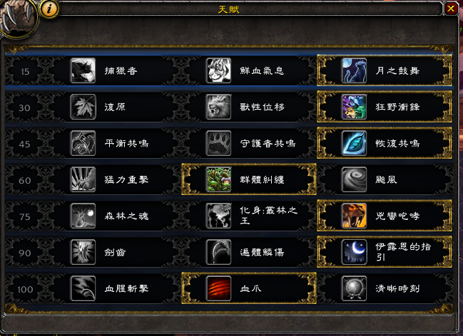 T5丛林之王和化身无变化,化身依旧可以战斗潜行,而坑爹的暴雪把凶蛮咆哮从技能变天赋,持续时间从42秒变20秒,伤害提升从40%变30%,虽然现在显示还是5星42秒,但是实际上5星只有20秒,不过有个BUG,当第一次5星之后,下一次计算的时间就是按照旧的持续时间计算。