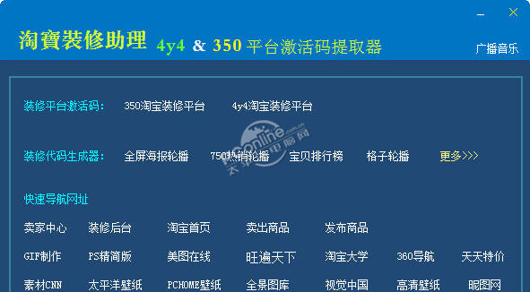 淘宝装修助理软件提取350装修平台,及4Y4装修平台每天免费限量发布激活码(激活码可激活申请平台账号,激活成功后将免费拥有一套永久淘宝装修模板)内置多种淘宝装修特效代码生成器(全屏海报轮播、950轮播,190轮播,750轮播等常用装修代码生成工具)加入卖家常用网址、各种素材网站入口,为淘宝卖家提供更快捷的工具。