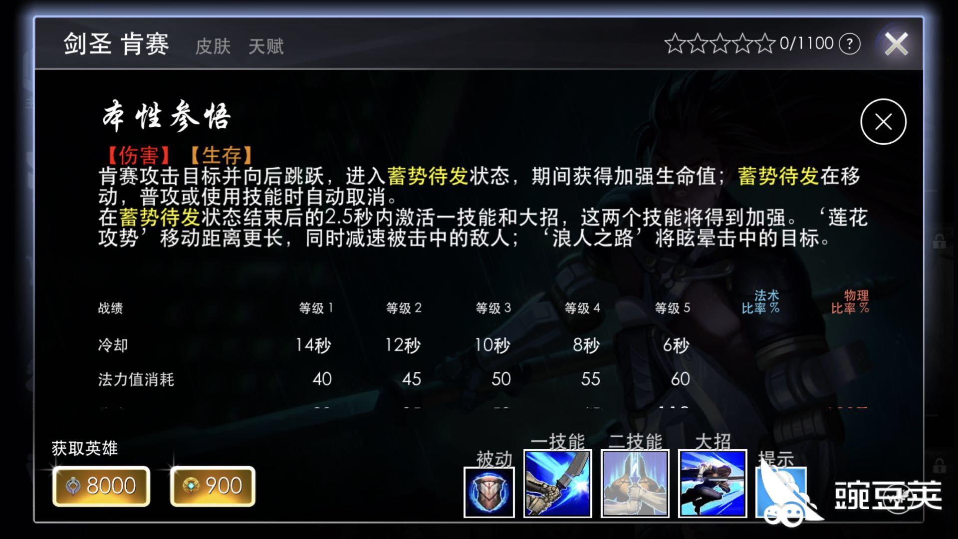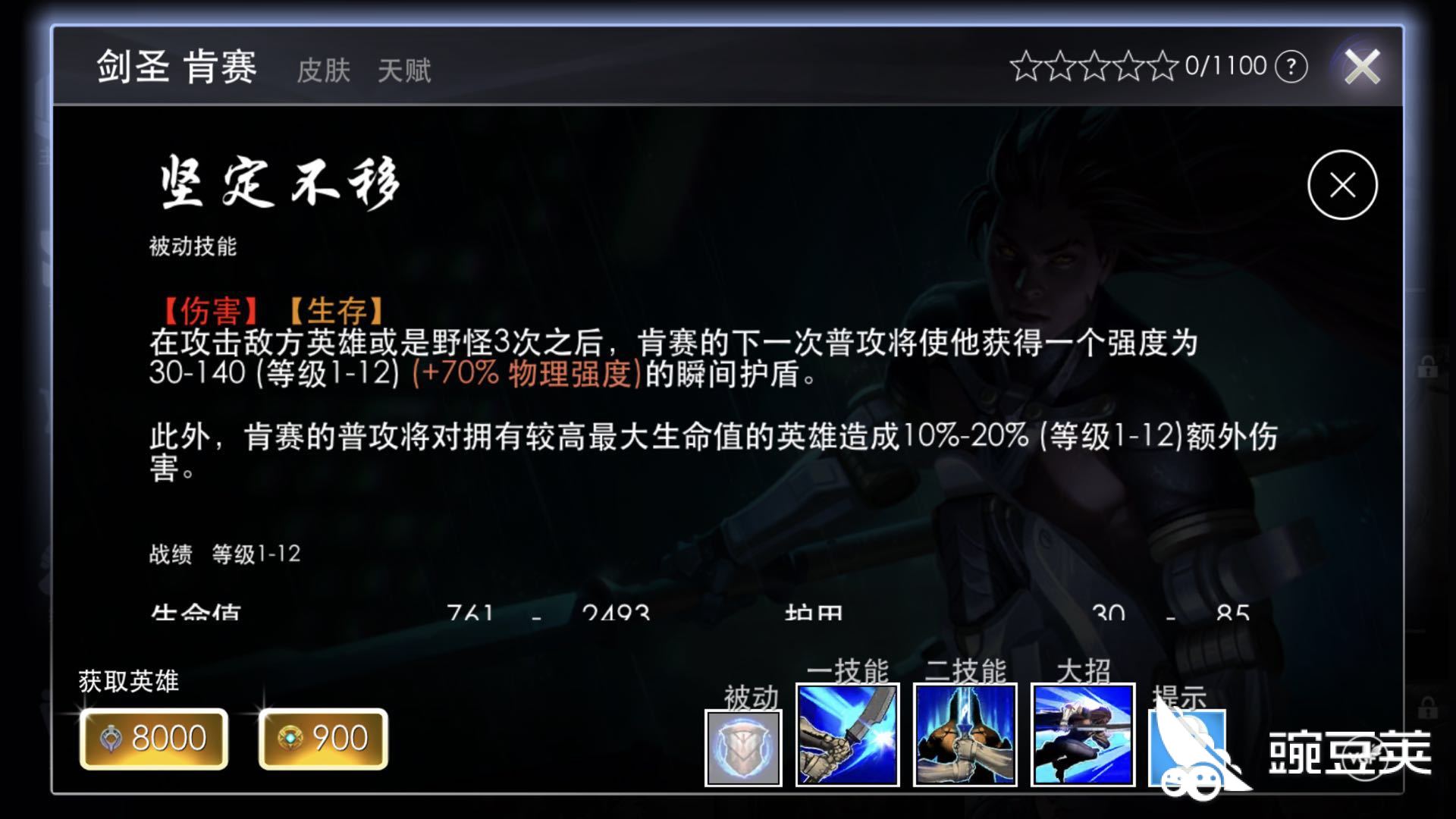 剑圣的被动技能,是对目标(比如对方英雄或者野怪)进行三次后,他的接下来一次普攻可以为他取得非常强大的护盾,因此打坦克就非常有利,就算对着对方满血的坦克,肯赛的持续攻击,不但为其得到更高的额外伤害,还可以获得更强大的瞬间护盾。