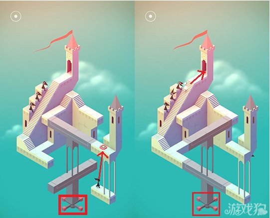 第四个场景中玩家需要踩到如图所示的按钮上纪念碑谷第七关,然后在快速进入如图所示的门,这里我们需要注意一下乌鸦,因为在你踩到按钮时它会企图去踩另一个按钮,所以这时候我们可以滑动如图所示的滑动方块,使乌鸦悬在半空中,好顺利让公主进入第五个场景。