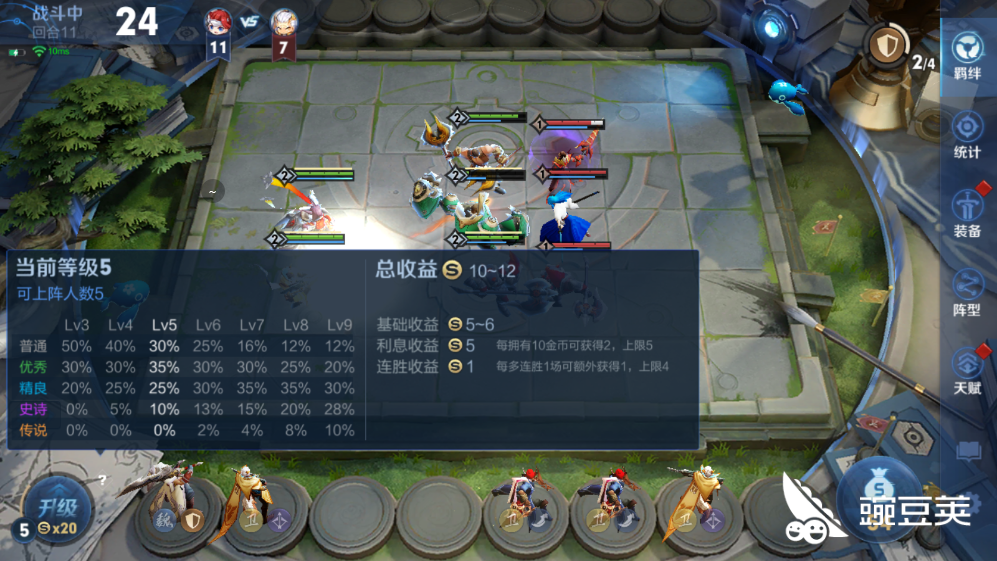 目前游戏中一点经验值的价格是1个金币,直接在左下角的经验按钮处点击即可购买金币进行升级了。我们3-4级需要的经验是12点,4-5需要20点,依次类推。