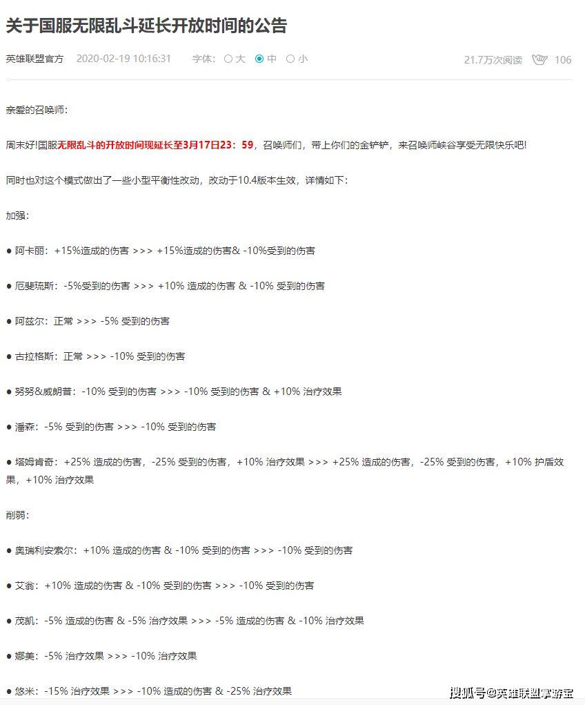 总结:以上内容就是针对lol无限乱斗(LOL官方公告:无限乱斗延长至3月17日,阿卡丽加强)详细阐释,如果您觉得有更好的建议可以提供给哪吒游戏网小编,lol无限乱斗(LOL官方公告:无限乱斗延长至3月17日,阿卡丽加强)部分内容转载自互联网,有帮助可以收藏一下。