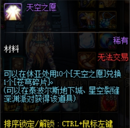作为95版本的毕业装备dnf史诗制作,泰波尔斯史诗同样以制作为主,切需要较长的制作周期,其制作涉及两种材料:小材料名为“天空之愿”,大材料名为“苍穹碎片”,10个小材料可兑换一个大材料。共有两种获取途径且都颇为重要,下面将分别介绍:
