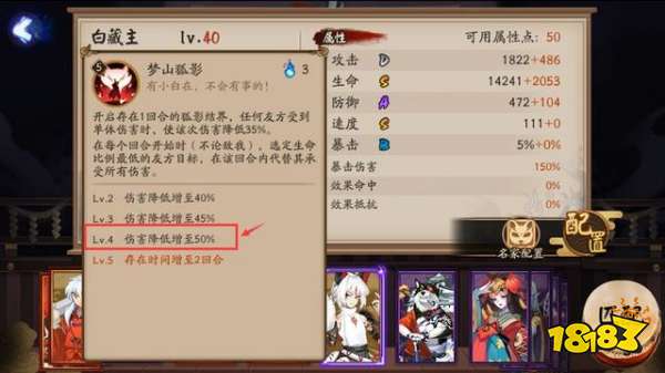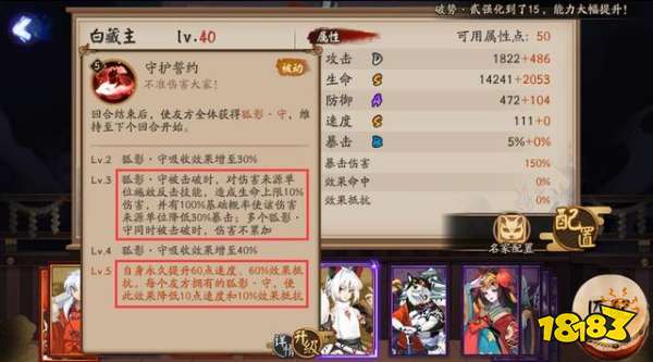 从面板就不难看出小白的定位是一个肉系辅助式神,速度111也可以说是中规中矩的辅助标准速度。一技能吃攻击加成的平A,可以减少对手10%的攻击sp大天狗,类似一目连。这里重点说说被动技能和大招。