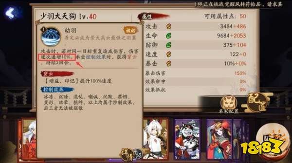 被动技能是小天狗比较核心的内容了,被控增加一倍的速度,相当于加强版的三味sp大天狗,而且是持续两回合(当然比起大天狗的直接免控还是差了些);