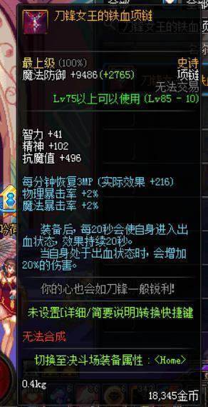 而对于自身处于出血状态,可能有人会认为自身怎么可能会处于出血状态?其实,自身属于出血状态下,有两件装备,一件是刀锋项链,一件是卡赞的诅咒。而对于卡赞的诅咒这把30级神器巨剑已经在这个版本中被淘汰,所以并不值得配上这件逆天的装备。