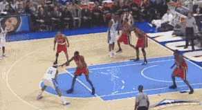 后来我慢慢领悟了一个能明显提升突破效率的技巧——“坐下运球”(那个教学视频上是这么叫的),不是什么招式,算是运球过人的基础动作,是每个突破者的基本操作,突破加速前有没有这个动作可以看出这个人水平是否够格。具体是这么做的:你运球时,突破加速前,两腿劈个叉(轻轻跳起来然后左膝盖向左后右膝盖向右前同时移动,动作要帅不要滑稽,自己估摸),落地后重心突然压低(背部几乎与地面平行),屁股突然一撅(良好的利用了臀部力量),之后蹬地突破,这样可以将过人的加速度提到最高。