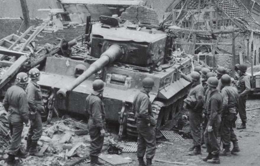 1945年2月超级潘兴,美军第三装甲师一台潘兴正前往把守埃尔斯多夫的一个路口,结果被埋伏在此的一台虎式一炮贯穿炮盾,炮手和装填手阵亡。第二发击中炮管,导致潘兴炮管中已装填的炮弹走火,整根炮管报废。第三发击中并打飞了炮塔指挥舱盖。不过虎式在伏击得手,装完B就想跑的时候卡在废墟里动弹不得,最后德军乘员只能弃车。(这样算不算潘兴首战1换1,打平)
