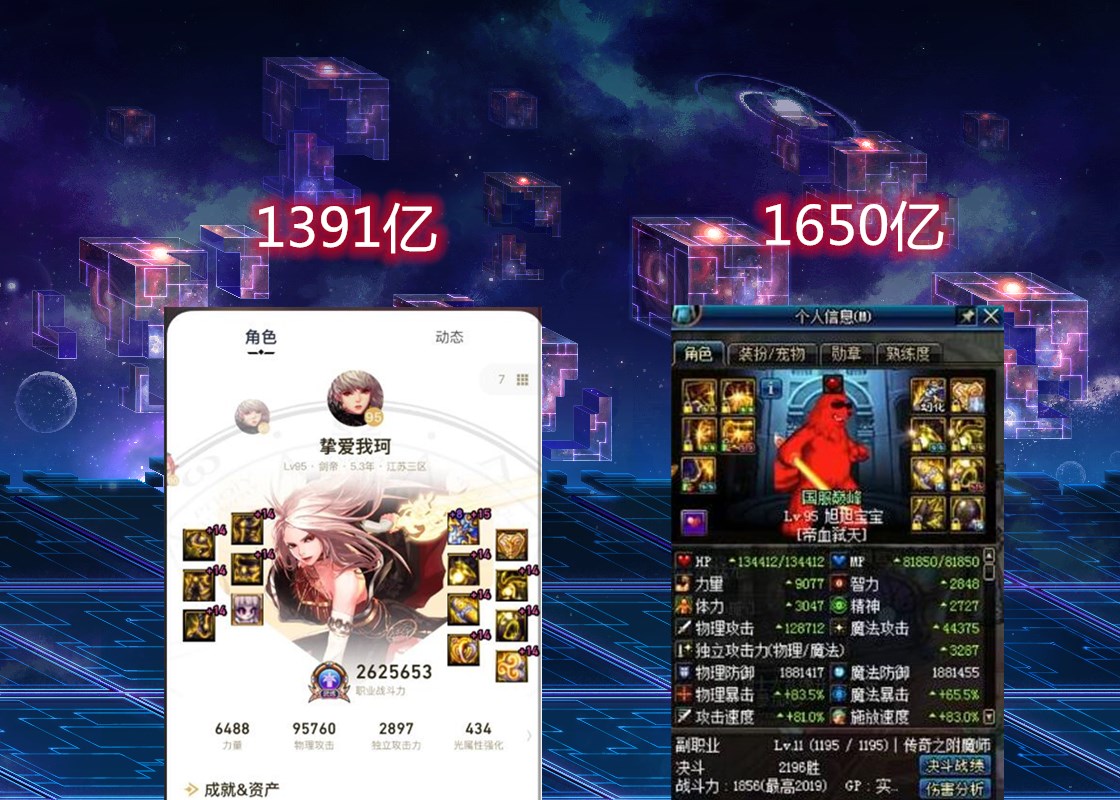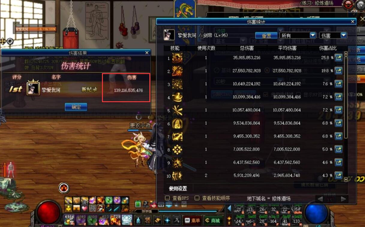 那么改版后的幻神剑豪到底有多强呢?就给大家举两个例子吧,首先大家应该知道目前旭旭宝宝全身红16,武器耳环红17的红眼打桩伤害是国服第一的,用实战手法吃3药,20秒绿桩最高能打到1650亿,那么国服最强的剑豪在这次改版后20秒打桩伤害又能到多少呢?答案就是1391亿。