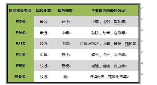 每一类暗器器具对应一种额外效果。而在新引擎AngelicaIII的物理技术支持下,不同的暗器器具在投掷或使用的过程中,会根据重量换算出重力做出不同的反馈,因此,飞行速度,飞行距离和额外伤害效果都不尽相同,更符合真实物理世界原理。