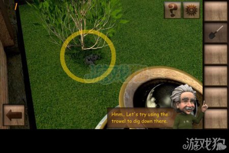 然后来到水池左边的地上,用铁锹去挖下图所标注的地方,于是我们就能得到一把钥匙了。拿着钥匙开门走人,第一关就算过去了。
