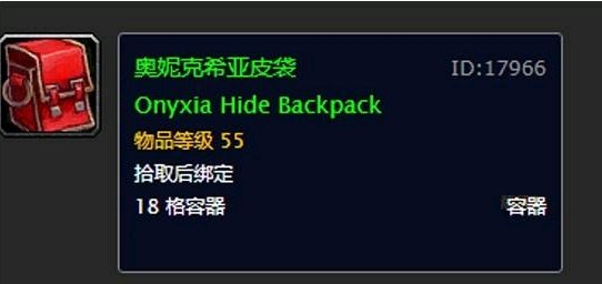 黑龙妹妹掉落的奥妮克希亚皮袋,唯一的绿色品质 18 格背包,不过黑龙MM的难度对于野团还是比较高的wow背包,所以前期想拿的话还是要跟公会团。