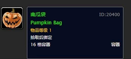 南瓜袋同样是 16 格,需要在万圣节期间野外 50 级以上的野怪掉落,一年一次的万圣节,很少有人会为了背包刻意等,所以大部分情况下这个背包都是放银行的。