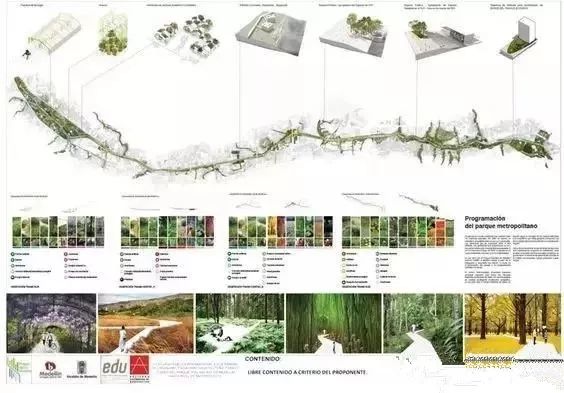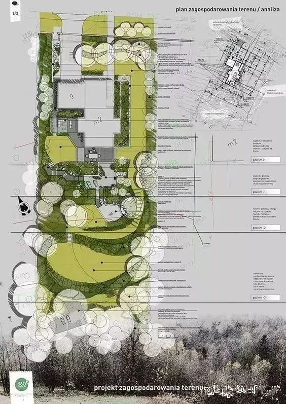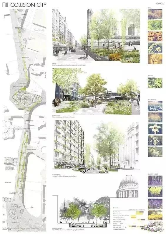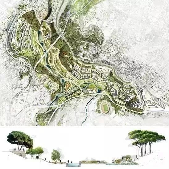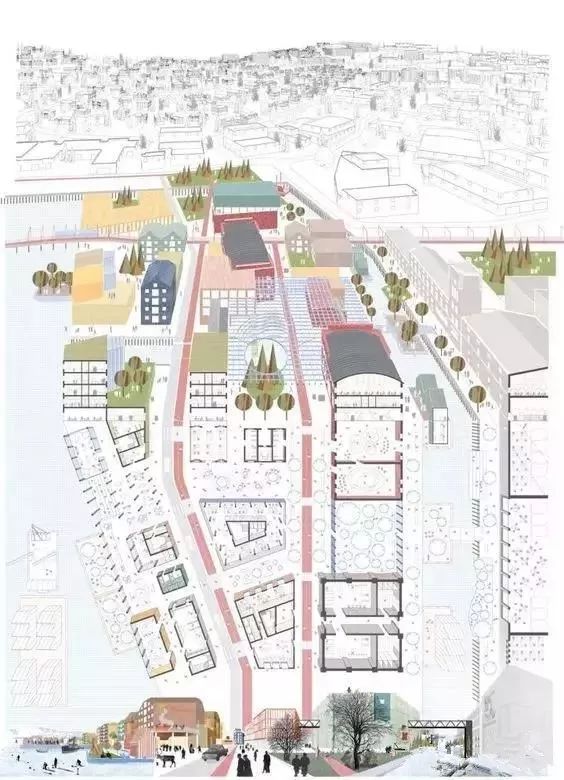 立面图、剖面图、鸟瞰图、轴侧图、细部详图、透视图、分析图等图面信息均以平面图为基点延伸发展而成,可将不同种类图面表达形式与平面图结合,于不同设计阶段展示设计该阶段的设计要点和思路。