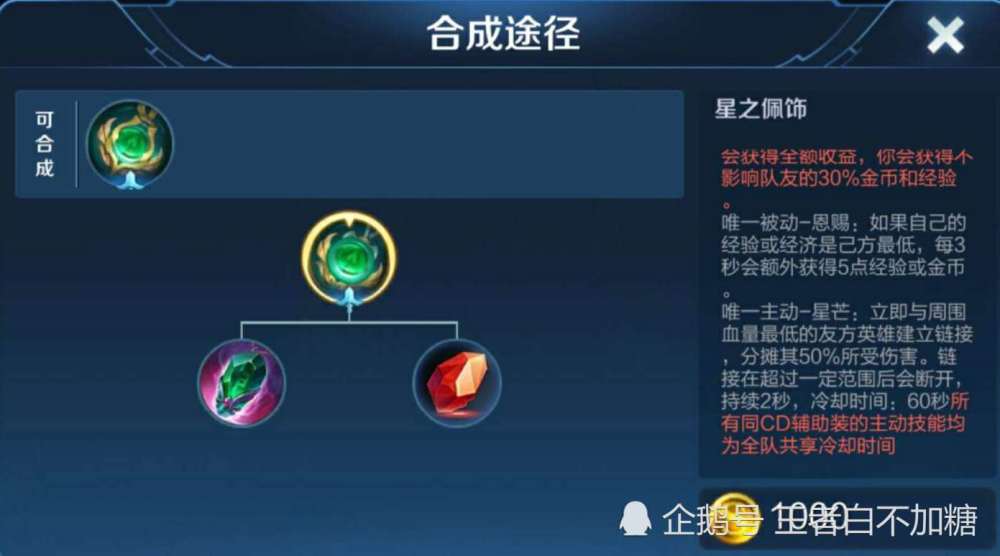 星之配饰主动为立即与周围血量最低友方英雄分摊50%伤害,但是只持续两秒时间,团战中伤害可能会持续比较久,一些英雄的爆发伤害也不止两秒钟。而且不是说你想和谁分摊就能分摊,不确定性太高。有时候打团血量最低的不见得是最重要的位置,保住关键C位才能决定游戏的胜负。因此这件装备风险高,收益却比较少,是比较亏本的辅助装。