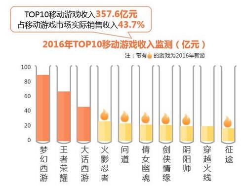 收入前十的移动游戏依次为:《梦幻西游》、《王者荣耀》、《大话西游》、《火影忍者》、《问道》、《倩女幽魂》、《剑侠情缘》、《阴阳师》、《穿越火线》、《征途》。
