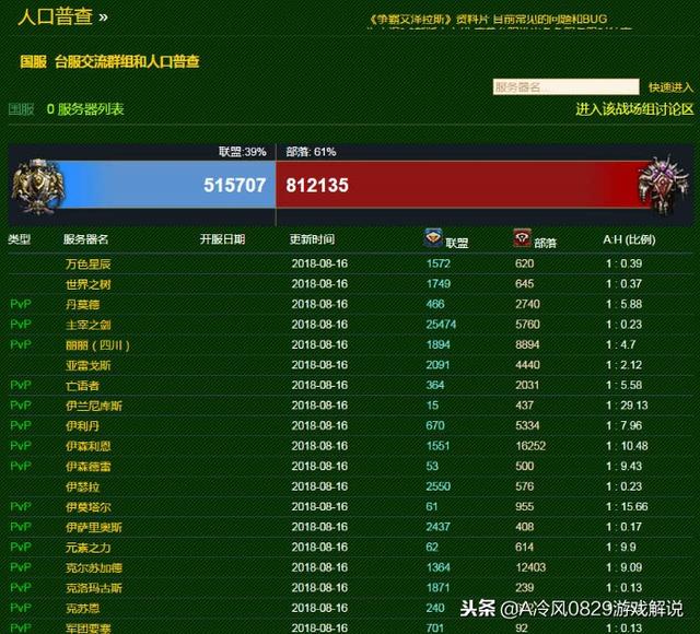 魔兽世界在8.0开启之后一共做了三次人口普查,第一次是在8.0开启的当天,那个时候属于魔兽“回潮流”人数是每年的巅峰(国服在线270W+)魔兽世界人口普查器,当时部落以75%的人数占比碾压联盟人数。两个多月后又一次人口普查,魔兽世界人数归于平静但因为8.0内容有些枯燥让不少wower选择半A状态,人数下滑严重(国服在线50W+),部落和联盟占比在7:3左右。