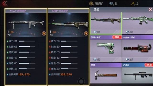 如图,MG3-银色杀手和M60-生化杀手相比,前者除穿透和主弹夹数和后者一致外,其他数据则全面碾压。