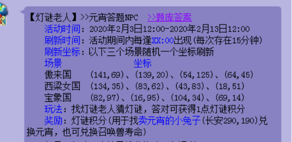 一年一度的元宵佳节正在悄悄来临,梦幻也如往年一般,准备了元宵灯谜。今年的元宵活动从2月3日12:00至2月13日12:00,一定要记住时间哦,不然错过了,就要再等一年的时间了。