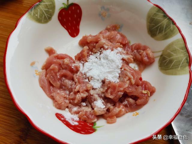5、梅条肉切丝,柠檬片腌制5分钟西红柿蘑菇汤,然后加入食用盐和淀粉搅拌均匀,再加入1勺食用油搅拌均匀。梅条肉口感比较嫩,买不到可以用里脊肉代替。