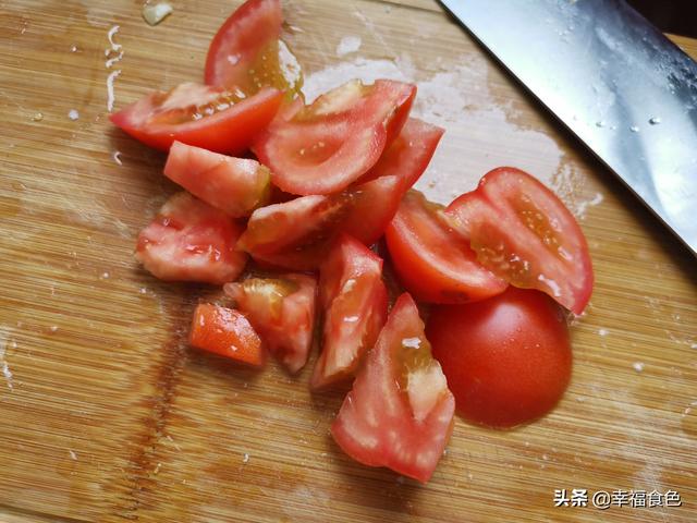 1、番茄洗净去蒂,然后切成滚刀块。番茄选择软硬适中的,太硬的那种比较生,煮汤口感不好。还是怀念小时候自家种的番茄,现在好难吃到那种味道了。
