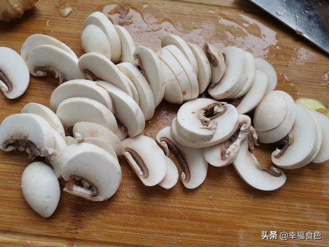 2、白蘑菇清水洗净,去掉根部(根部口感不太好),然后切成片状备用。白蘑菇也叫口蘑,肉质鲜嫩有一种独特的清香,很好吃。