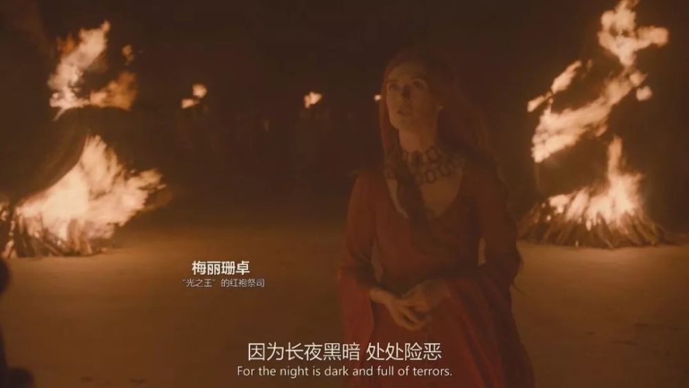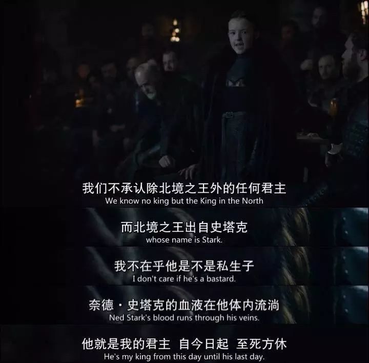 琼恩雪诺,是一个史塔克,他和守夜人宣誓,激起了观众心中的荣誉、忠诚和信仰。“长夜将至,我从今开始守望,至死方休。我将不娶妻、不封地、不生子。我将不戴宝冠,不争荣宠。我将尽忠职守,生死於斯……我将生命与荣耀献给守夜人,今夜如此,夜夜皆然。”这三个角色承载了观众对翻盘的期待。