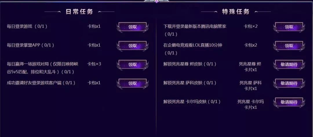 先说任务,请注意任务形式,分有“日常任务”和“特殊任务”,日常任务每日刷新,可以重复获取,特殊任务则是一次性任务,完成了之后就不刷新了,请注意哈,通过完成日常任务lol皮肤兑换,每日最多获得6个卡包,请注意,抽出来的卡片可能会重复。特殊任务中,购买了新的死兆星皮肤,会直接获得相应的卡片。