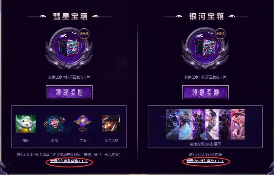 注意看这里最后说奖励,奖励分两种宝箱,第一种是彗星宝箱,需要20张卡片可以开启,第二种是银河宝箱,需要22张卡片可以开启,请注意,两种宝箱的奖励内容不同,各位可以在活动页面上查看宝箱的奖池。