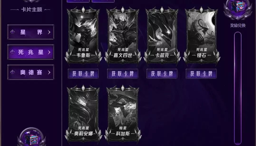 重点然后说一下卡片的组成,这次的卡片组成主要是三个系列皮肤,这些皮肤哪怕是你已拥有,也不能直接获得它们的卡片,都是需要抽的,第一个是星界(掠星系列),第二个是死兆星,第三个是奥德赛,如果细心的小伙伴会发现,这三个卡片中的卡片数量加一起只有20张,星界有7张lol皮肤兑换,死兆星6张,奥德赛7张,可是奖励中有一个22张卡片才能领取的箱子,那怎么办?请注意,3款新的死兆星皮肤卡片在后续游戏更新之后会加入到卡片奖池中,所以卡片的总是应该是23张。