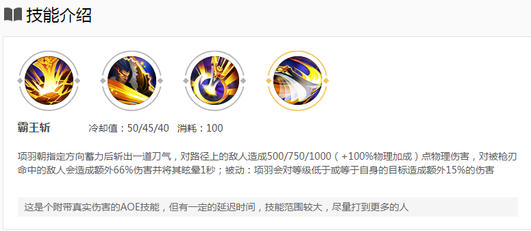 霸王斩,超大的aoe范围,在短暂蓄力后打出,不错的爆发输出,并对被枪刃命中的敌人造成额外的眩晕,配合一技能控制之后可以打出长时间的控制,在先手开团的时候配合击退跟眩晕,使得敌军无从还手。这个技能也可以配合闪现打出,灵活的打出控制。