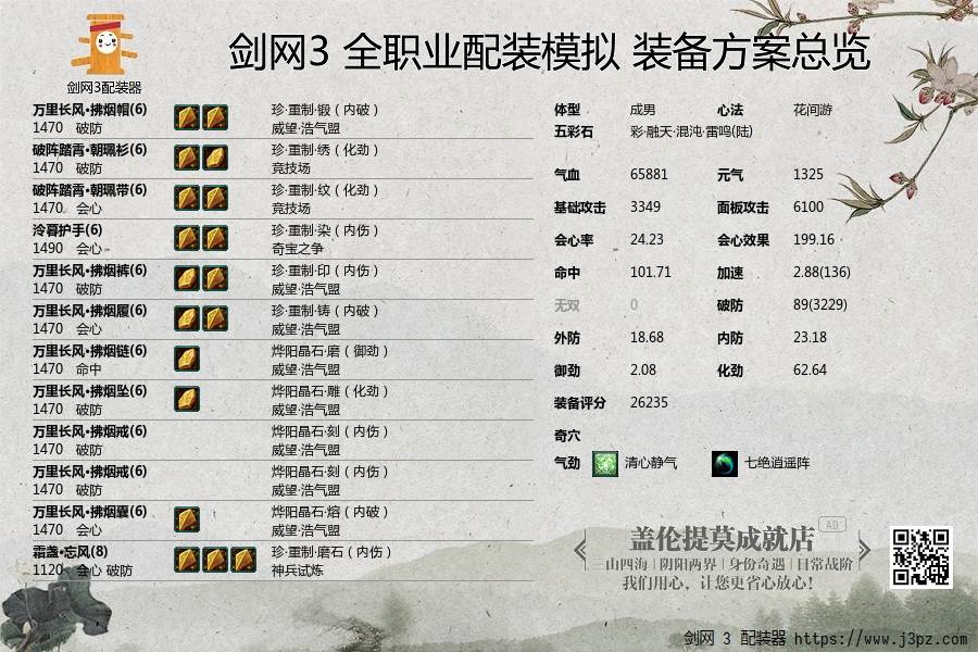 花间配了两套装备,一套主会心,一套主破防。大家可以根据自己的喜欢来选用。护手还是选用(世界BOSS掉落)加速对于PVP花间来说不需要太高加速。这个版本的花间乱撒是改为加会心了,所以会心套开上乱撒的话是到55的会心,加上阵眼的加成就是2500的破防,所以就算不出多会心的情况下这个输出也是不低的。破防套就不多说了,出会心基本上就要死人了。而且破防套的会心也不是特别的低。在这里两套都可以用,看你们个人爱好,因为两套都是自己配的感觉不错的配装。当然还有一种配装是不怎么建议的,是换上御化的项链,打上命中附魔,加上两个命中孔,命中可以在99。但是个人觉得花间不需要太多的御化,因为当你把花间装备堆成了御化你就再也震慑不住敌人了,花间要做的就是,从看到我的那刻起就要让敌人所有的焦点都在我身上,眨一下眼睛,则魂飞魄散,核弹般的存在。